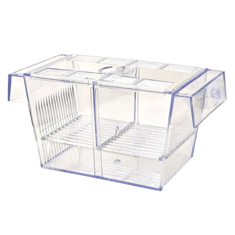 Paridera de plástico 2×1 con tapa, incluye un divisor para separar los peces adultos de los alevines, divisible en tres compartimentos. Su diseño sellado con rejillas laterales permite un correcta oxigenación del agua pero en un entorno controlado y tranquilo, sin corrientes de agua que puedan molestar a los pequeños alevines o los peces enfermos que tengamos bajo supervisión. Sujeción sencilla mediante ventosas.